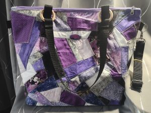 This tote is made using the patchwork “quilt as you go” panels with zigzag topstitching that I made while staying in our motorhome last summer…